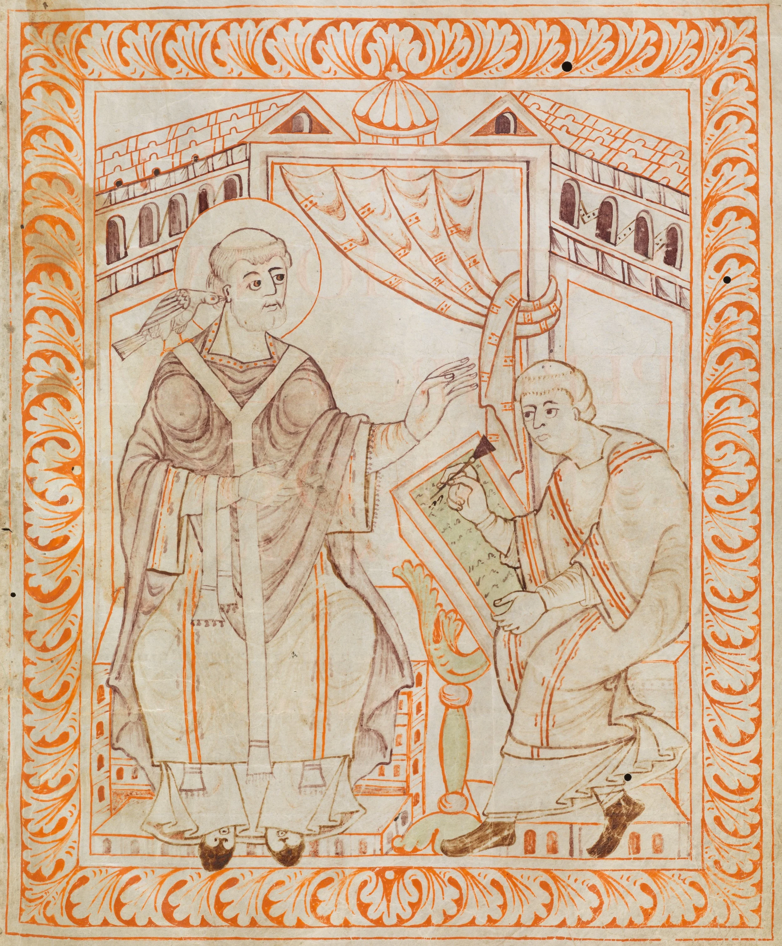 Pope Gergory receiving chants from the Holy Spirit (Cod. Sang. 390, source)