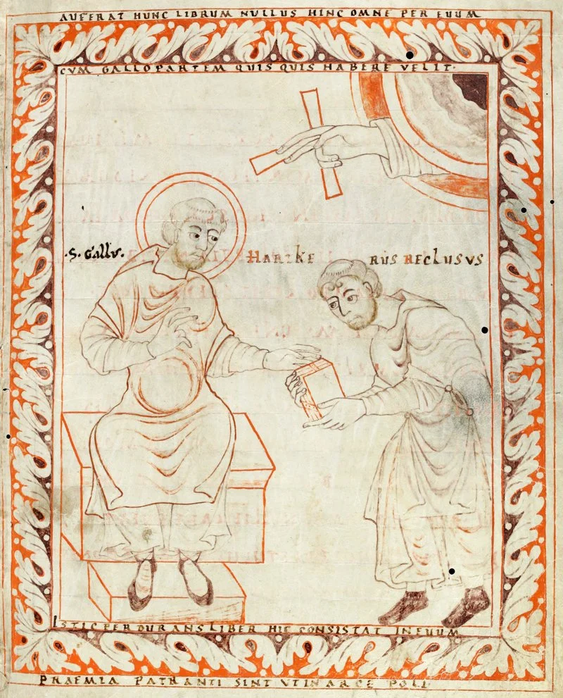 St. Gall blesses the singer Hartker’s antiphonary, late 10th century. (Cod. Sang. 390, source)